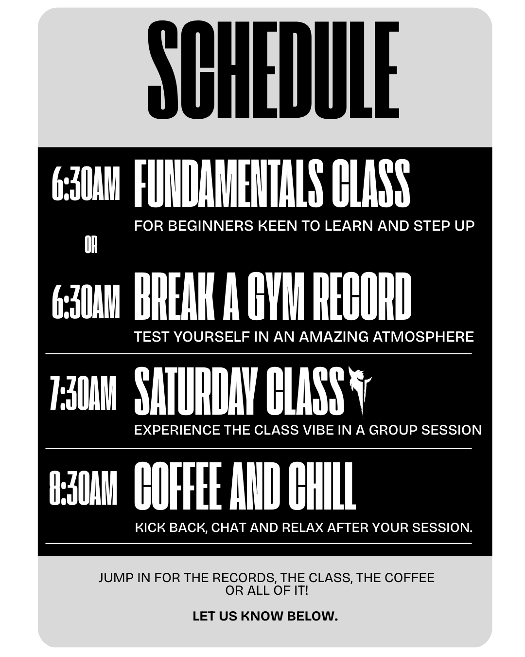 Running alongside Fundamentals, this session is for those who already train and want to test numbers or benchmarks. This coincides with our gyms current testing week.